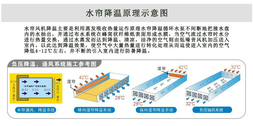 水蒸發吸熱是自然界的一種很普遍的物理現象,降溫水簾降溫同樣運用了這一原理,溫簾式降溫系統與負壓風機的綜合運用正是利用了水蒸發吸熱而使空氣冷卻的熱學原理,充分展示了水蒸發吸熱原理的三大要素。